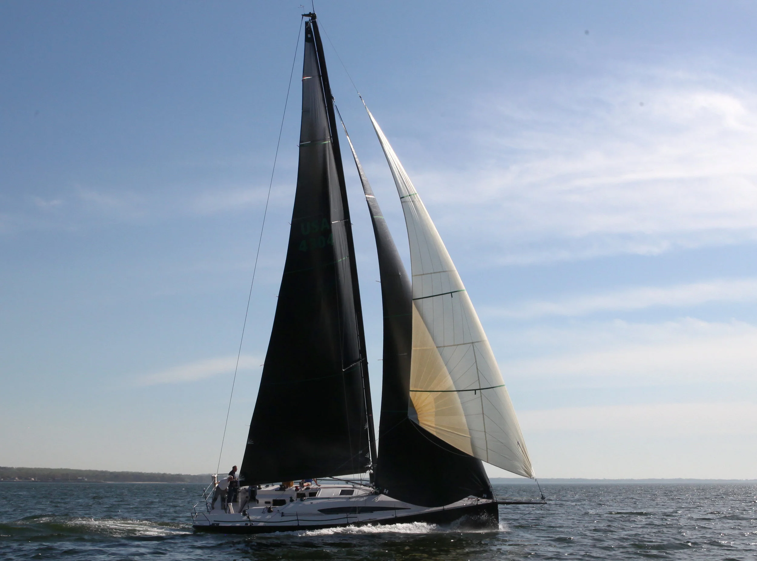 The Sydney 43 CHRISTOPHER DRAGON sporting her Flying Jib, double-head rig. Set from the end of the sprit along with a regular jib, the Flying Jib makes the boat significantly faster when close reaching.