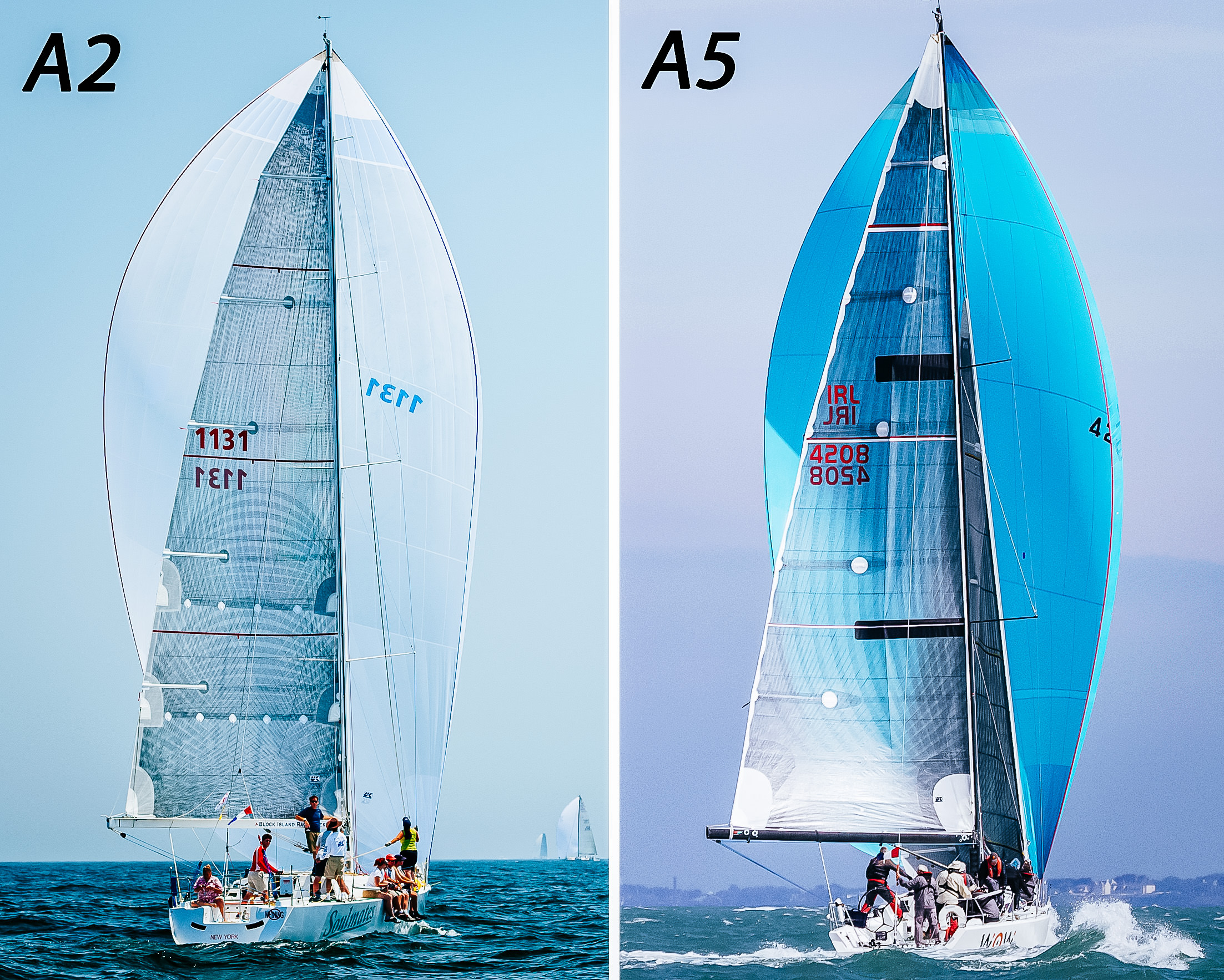 This comparison vividly shows the difference in size and shape between an A2 (full-sized spinnaker) and an A5 (small heavy air asymmetric). The A2 is wider and had full shoulders, while the A5 is much narrower with almost no shoulders.